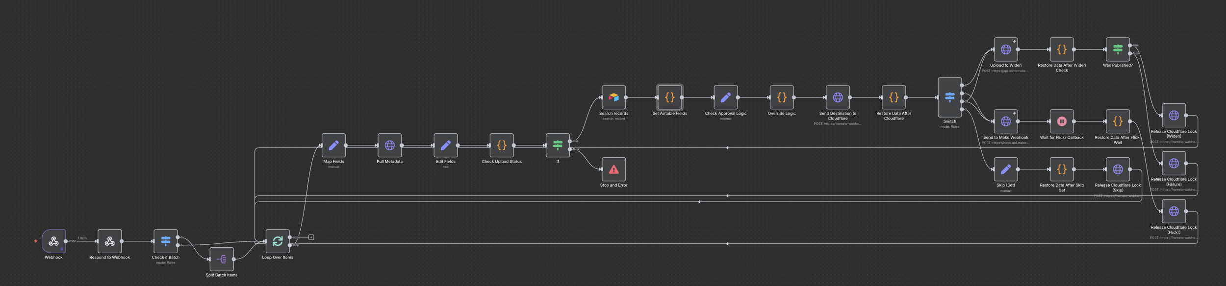 We realized that traditional gallery tools weren't fast enough for our "Real-Time" requirement. We needed a system where we could trigger a publish action directly from the review tool. So, we connected Frame.io to n8n (a workflow automation tool) to build a custom engine.